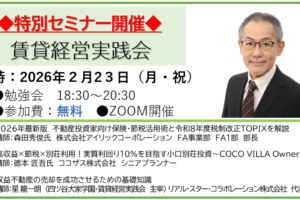 「賃貸経営実践会」特別セミナーを開催いたします。年度末緊急開催セミナー「税制改正・節税・高収益別荘・物件売却まるかじりセミナー」ZOOM開催を開催致します。通常、有料会員向けの勉強会ですが、今回は年度末の緊急開催で賃貸経…