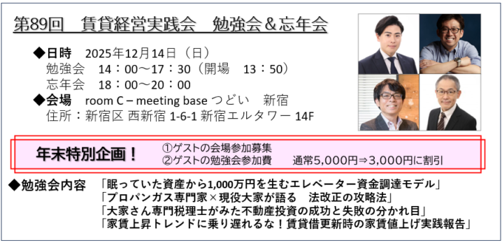 2025年12月14日(日)、第89回 賃貸経営実践会 継続勉強会を会場(@新宿)開催いたします! 有料会員向けの勉強会ですが、今回は年末特別企画のため、ゲストの会場参加も募集✨いたします。 日時:2025…