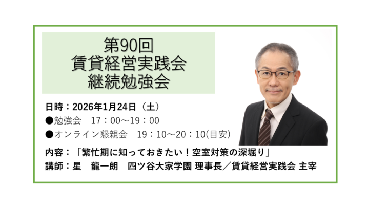 2026年1月24日(土)に賃貸経営実践会 第90回 継続勉強会「繁忙期に知っておきたい!空室対策の深掘り」をオンライン(ZOOM)開催いたします! 有料会員向けの勉強会ですが、今回は、ゲストの会場参加も募集ɲ…